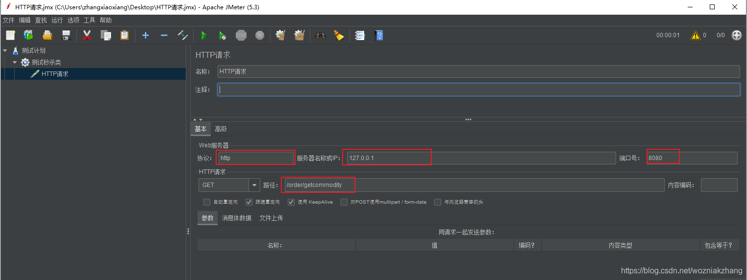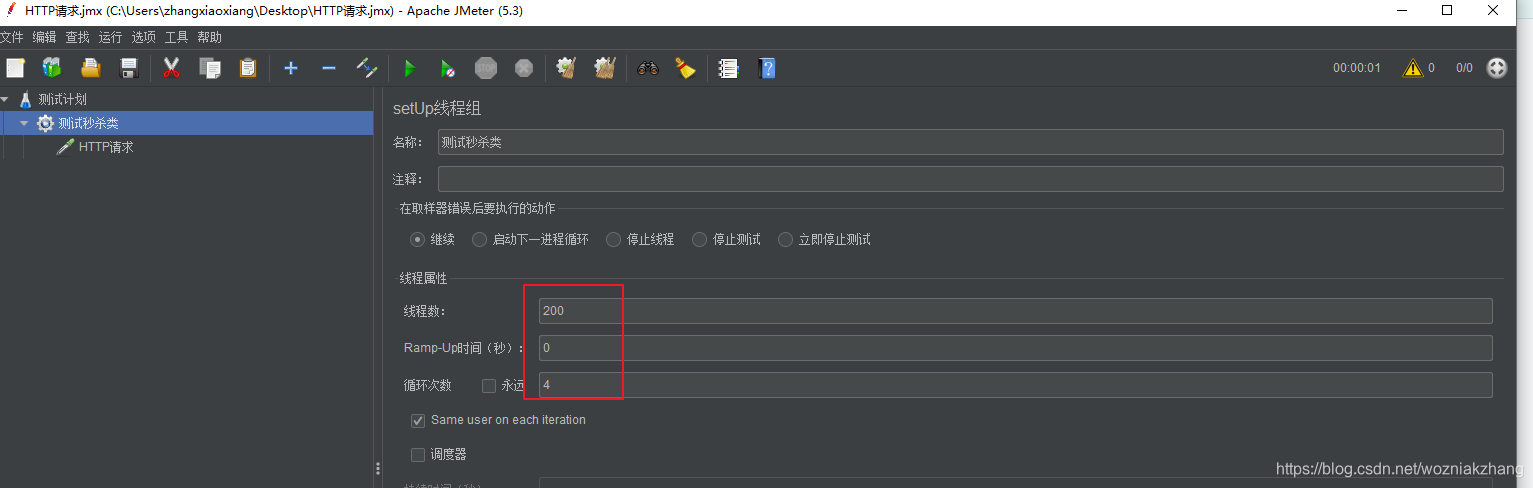 配置Jmeter,配置模拟并发和访问接口,如下两张图(不太会配置的可以百度Jmeter的使用)