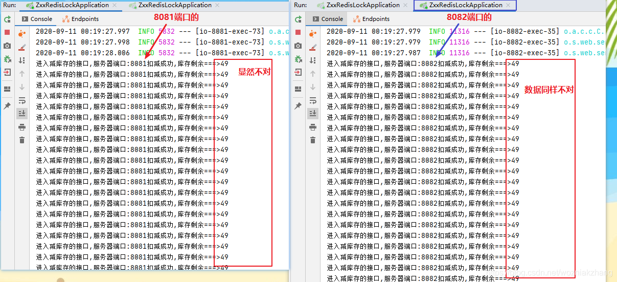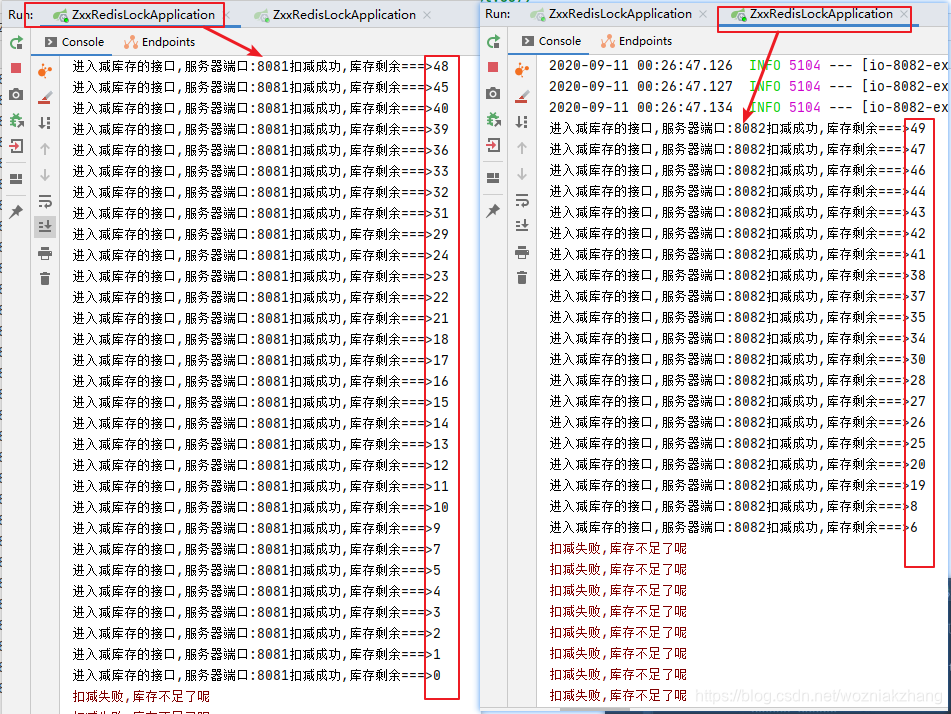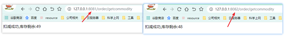 此时可以启动两个实例,可以访问两个接口,都可以实现减少库存,如下图