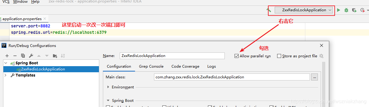 application.properties文件配置(注意端口可以配置8081和8082,多实例启动,模拟多肽tomcat服务器,idea的多实例启动方式如下图)