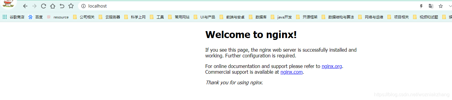 是否启动成功,访问http://localhost 即可,如图即为正常启动后的NGINX默认页面.