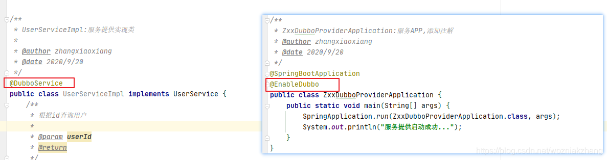 3:添加相关注解(注意新版本有的注解也更新了,例如@Service更新成@DubboService,终于不会和spring提供的@Service搞混淆了)服务实现类接口加@DubboService和启动类加上@EnableDubbo