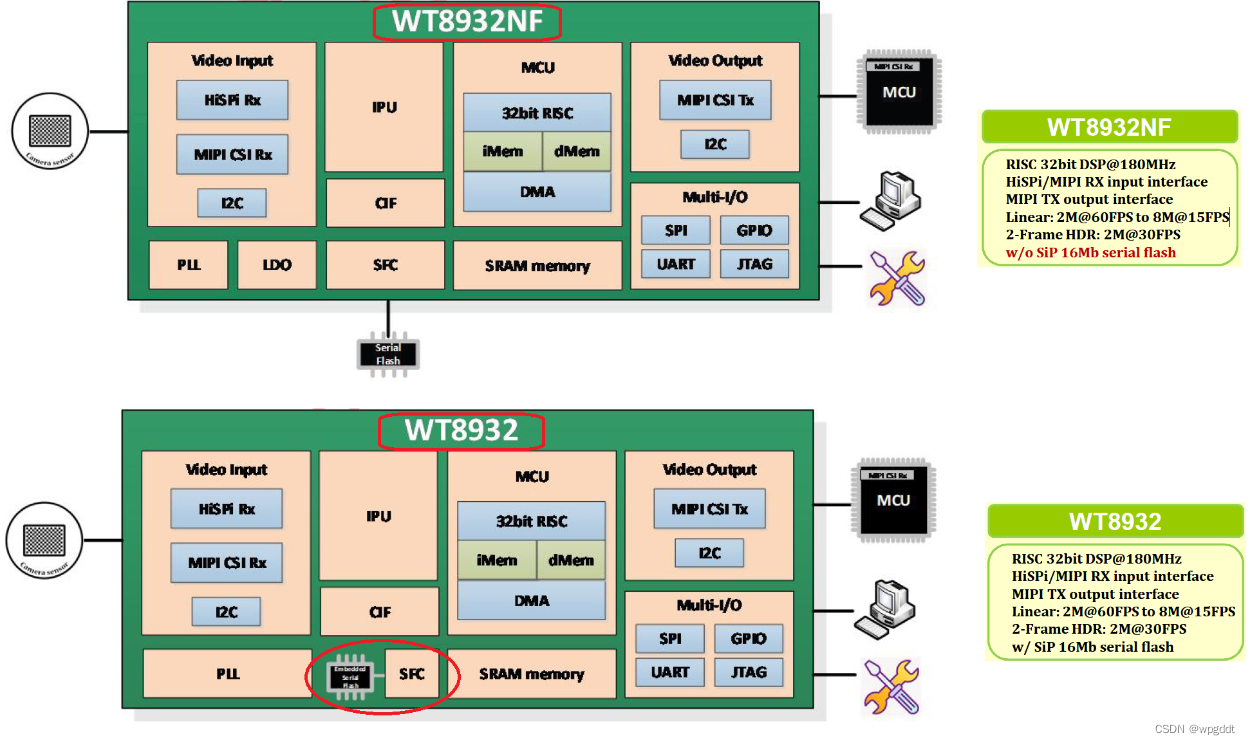 ● WT8932 为高性能图像处理器,它采用 32 位 RISC CPU 和 DSP 指令集,运行频率高达 180 MHz,并针对具有 MIPI 接口的图像传感器进行了优化。此外处理器内嵌硬件图像处理器单元 (IPU),提供AEC、AGC、AWB、HDR、RGB-IR...等丰富的图像技术支持功能,硬体采用影像标准界面及提供丰富的API影像优化设计工具。支持高达 8 兆像素的输入分辨率,为相机应用提供实时和卓越的可视性技术,且硬体设计上需要很少的外部组件,可以轻松集成到相机模块中。