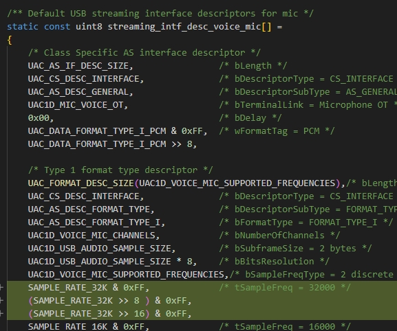 首先,我们要修改的是USB 音频流描述符,这得让PC知道设备支持什么参数。这里面主要是添加32k采样率的描述