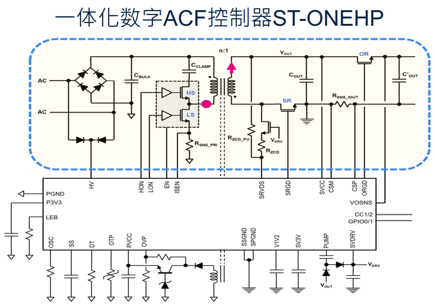 ST-ONEHP是ST-ONE系列的第三款控制器,该转换器采用ACF架构,可确保在高功率输出和高频下表现出色的能效。芯片横跨初级&次级,次级侧整合了同步整流和USB PD功能,节省物料成本及PCB面积。