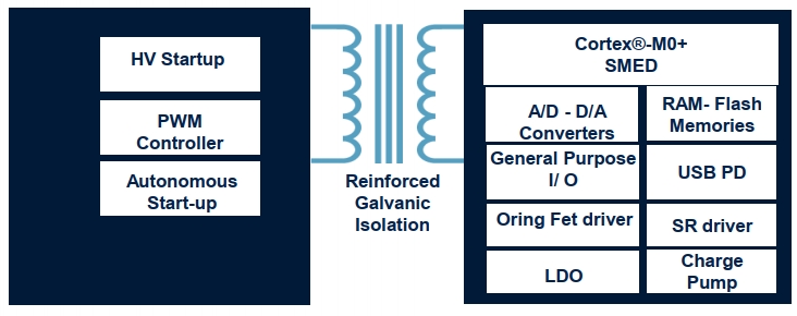 ST-ONEHP内置的Arm® Cortex®-M0+ MCU,负责整体控制。该MCU预装经过认证的USB PD软件,进一步简化最终产品取得USB logo资质的申请程序。该MCU搭载64KB Flash,可以储存客制化的功率转换代码。