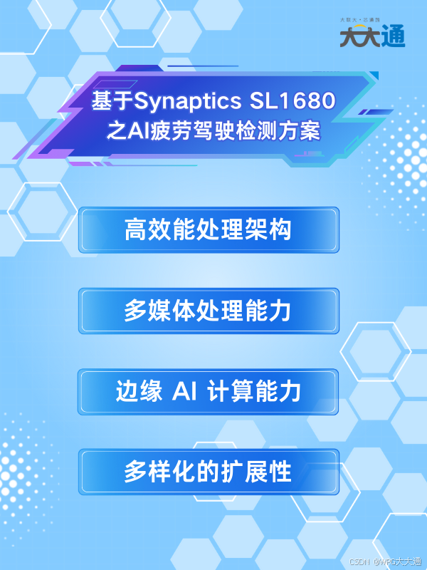 大联大诠鼎集团推出的基于Synaptics SL1680之AI疲劳驾驶检测方案。Synaptics SL1680 作为一款高性能、低功耗的 AI 原生 SoC,为驾驶安全解决方案提供了稳定的硬件基础,加上先进的 AI 模型,可以实现实时、精准的疲劳驾驶检测。