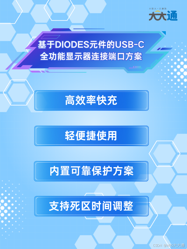 具体方案详情可点击:基于DIODES AP43781+PI3USB31531+PI3DPX1207C的USB-C PD& Video 之全功能显示器连接端口方案 - 大大通(简体站)