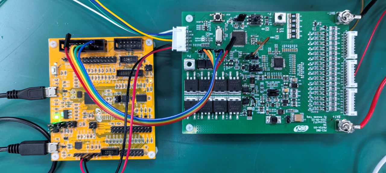 如下图所示,绿色板为 LKS32MC453 MCU 搭载 AFE BM81710H 实物板,黄色板为 SWD 程序烧录板。硬件连接好,接下来烧录程序,程序实现 MCU 使能 wake up 引脚高电平,唤醒 BM81710H,等待 70ms 使 BM81710H 内部系统稳定,MCU 与 BM81710H 进行 I2C 通讯,调用读取 BM81710H ID1、ID2 寄存器函数,并将获取的 ID1、ID2 的值通过 UART 打印到 UART 串口助手上。