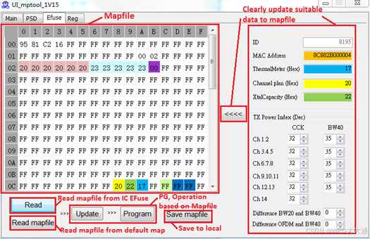 3,点击箭头,将参数导入map,再依次点击Update和Program写入Efuse;
