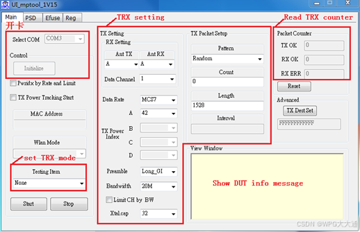 B,“Packet Counter-RX OK/RX ERR”将显示结果,在下一次测试前一定要点“Reset”将Packet Counter清零。