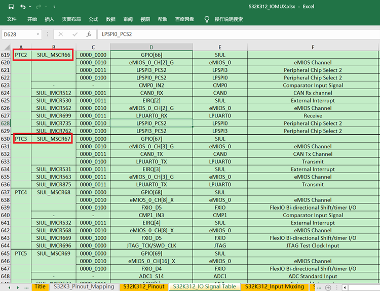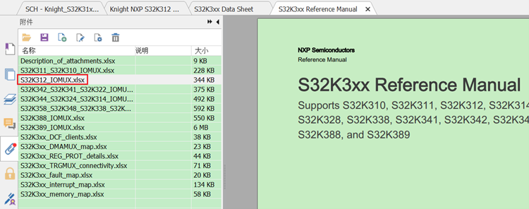 首先要清楚UART模块必然会有Port、DIO、UART、IntCtrl,故新建工程后逐个来配置。打开《S32K3xx Reference Manual》在左侧目录书签的附件栏可以看到很多有用Excel表格,在其中找到《S32K312_IOMUX.xlsx》,