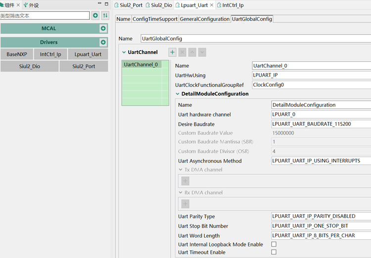 故在Port组件栏也是如此配置第一功能LPUART0_TX和LPUART0_RX DIO口,