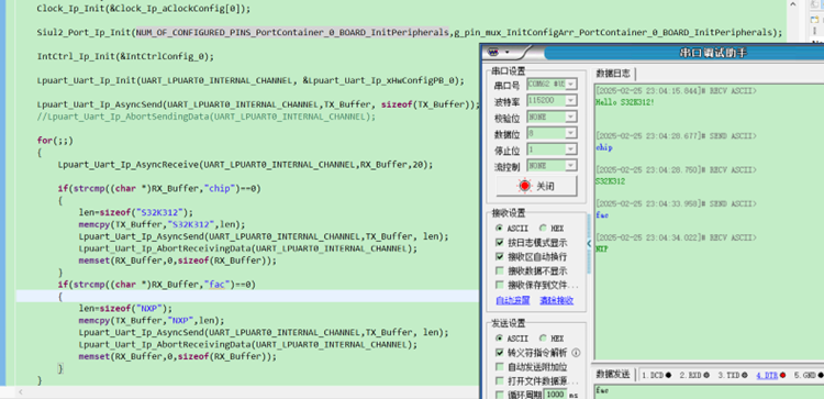 然后还是按照第1篇环境搭建教程所说点击编译再仿真就能看到实际运行效果,如输入“chip”,S32K312回复“S32K312”,输入“fac”,S32K312回复“NXP”等等类似,