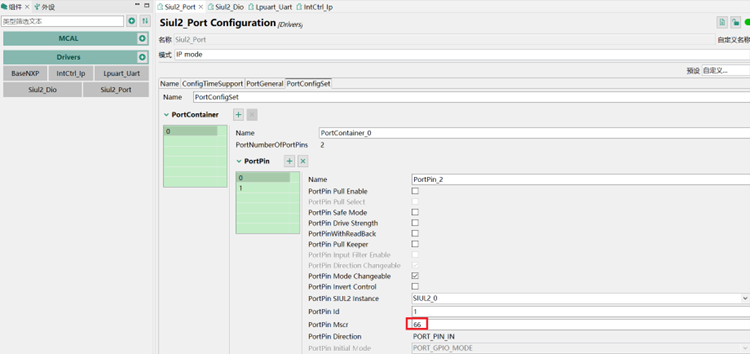 切到外设页,需要添加DIO、UART、IntCtrl模块即第一功能、第二复用功能、中断配置项,在外设页组件栏,配置Port的属性因为有两个引脚需要在PortContainer下PortPin依次添加两项,而关键管脚编号Mscr需要查IOMUX表格的“S32K312_IO Signal Table”页,可以查看到PTC2是SIUL_MSCR66,PTC3是SIUL_MSCR67,