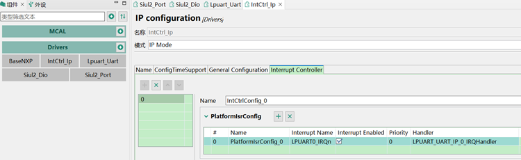 然后就是类似STM32的NVIC中断矢量配置,因为PTC2和PTC3属于LPUART0,故中断矢量类型是LPUART0_IRQ0,ISR对应也设成LPUART_UART_IP_O_IRQHandler,