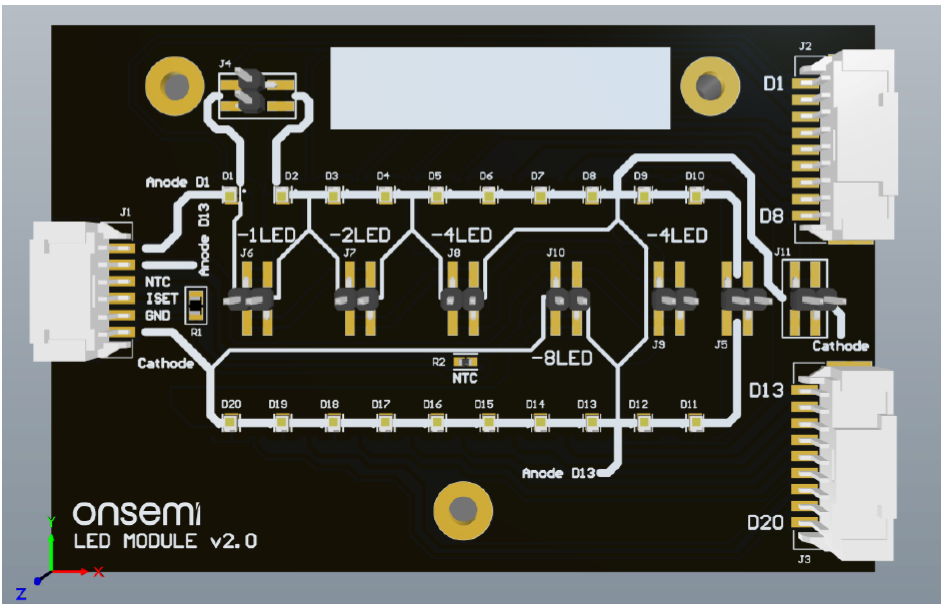 LED 模组 v2.0 旨在模拟从 1 到 20 个 LED 的各种负载。透过短接特定的跳线,可以绕过 LED 灯串的某些部分,从而有效减少 LED点亮的数量。这允许灵活配置 LED 灯串长度。此模组可分成两个独立的灯串,LED D1-D8 和 LED D13-D20 由像素控制器单独控制。