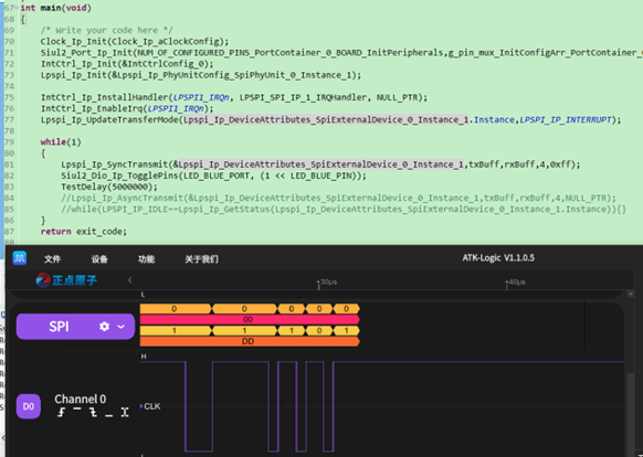 我们操作SpiMaster的主要接口在Lpspi_Ip.h、Lpspi_Ip.c里,具体有Lpspi_Init/Lpspi_SyncTransmit/Lpspi_AsyncTransmit/Lpspi_Ip_UpdateTransferMode函数。在主函数添加以下代码: