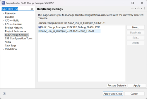 但是我们还缺少将导入的例程烧录进芯片的途径,不仅需要我们准备烧录工具,也需要安装S32DS对接电脑烧录USB的底层驱动。右击打开任意一个导入例程的“Properties”,在点选右边的“Run/Debug Setting”,可以看到例程提供了两种基础的烧录方式,以“PNE”结尾的是使用Multilink工具,另外一个则是Jlink的烧录配置。