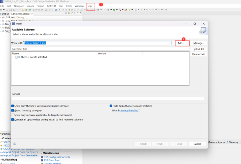 下面我们通过S32DS安装。选择“Help”中的“Install New Software..”,并点击出现的对话框中的“Add..”