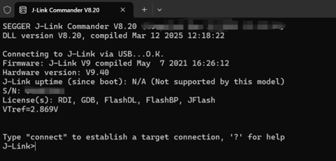 安装完成后,我们可以打开“J-Link Commander V8.20”,如果这时板子已经通过jlink硬件连接到电脑,你会看到: