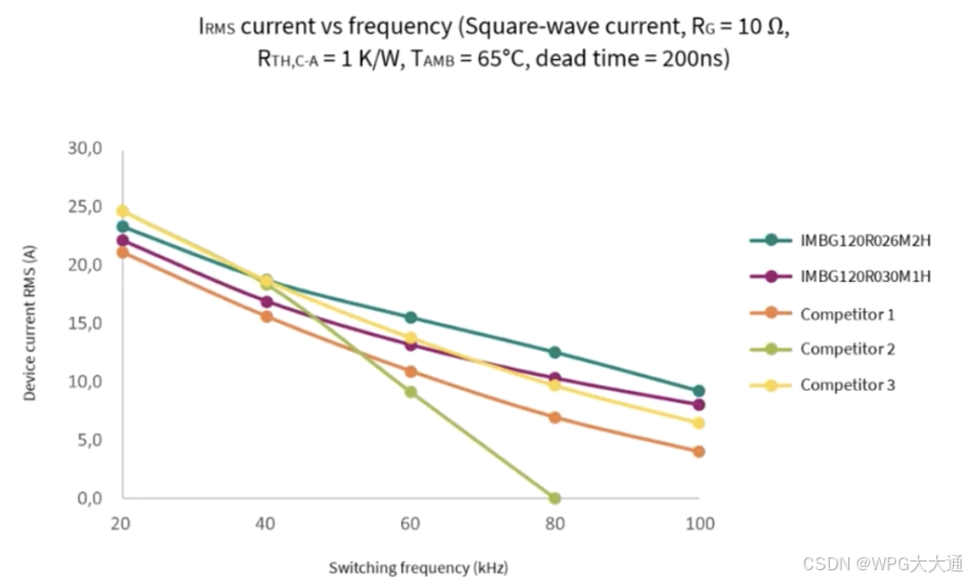 更低的优值使得G2开关损耗更低。因此,在高开关频率条件下,G2的电流能力更加出众,性能优于G1和同类竞争对手。