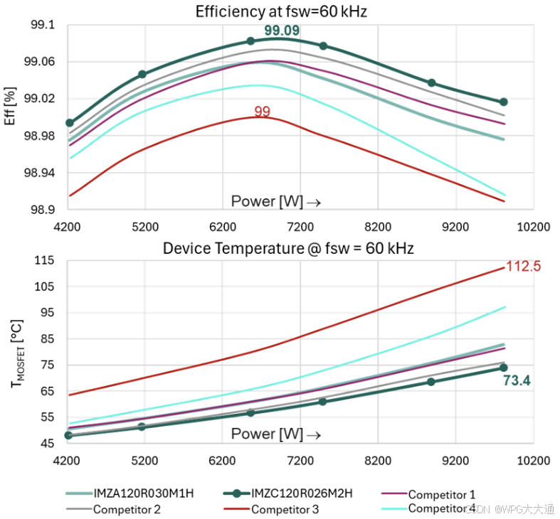 从测试结果可以看出,G2 IMZC120R026M2H最高效率可达99.09%,优于G1及竞争对手。在保持最高效率的同时,G2 IMZC120R026M2H最高结温也仅有73.4℃,比最恶劣的competitor 3的112.5℃低了将近40℃。