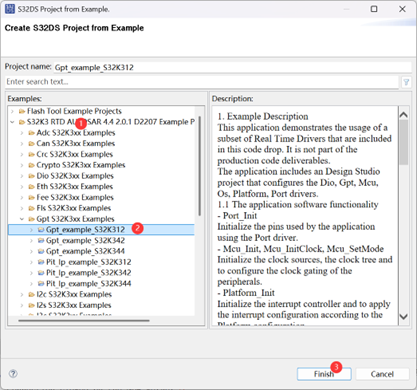 打开S32DS,点击“File” “New” “S32DS Project from Example”,选择出现的对话框中的“S32K3 RTD AUTOSAR 4.4 2.0.1 D2207 Example Projects”,在下面找到“Gpt S32K3xx Examples”,选择 “Gpt_Example_S32K312”,点击“Finish”完成项目导入。