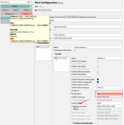 我们可以先选择熟悉的模块比如 Port 模块解决问题。打开 Port 模块后,可以看到 PortPin Mscr 是错误的,这里和之前博文提到的情况相同,是切换封装后,官方开发板的LED在Knight评估板上不对应了。这里我们改为 PTB10,即 Mscr = 42.