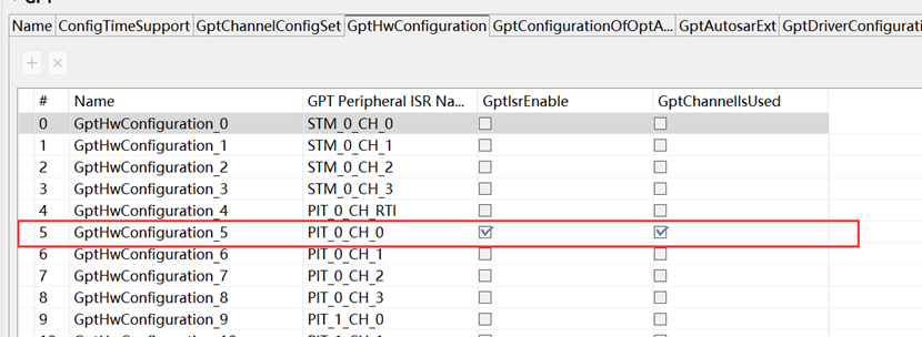 接下来是选择Gpt的外设源,选择GptHwConfiguration选项卡,可以选择Gpt的硬件触发源,这里默认选择为PIT模块的CH0.