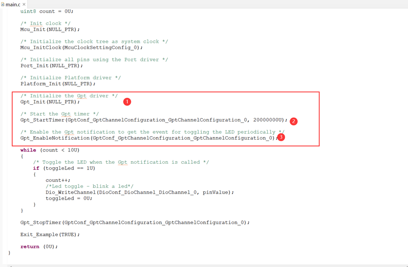 回到项目代码,打开“main.c”,查看代码。可以看到相较于之前Port项目的函数,还多出三个Gpt模块的函数,依次为1初始化函数,2定时器启动函数和3回调函数初始化函数。