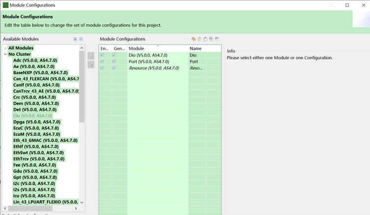 建成后需要像S32DS的CT一样配置模块,右击工程选择“Module Configurations”,右侧有需要的模块,双击添加这里添加Port、DIO模块,