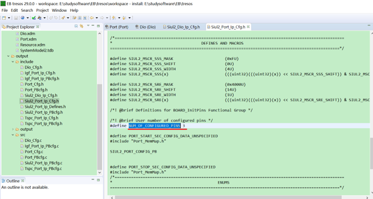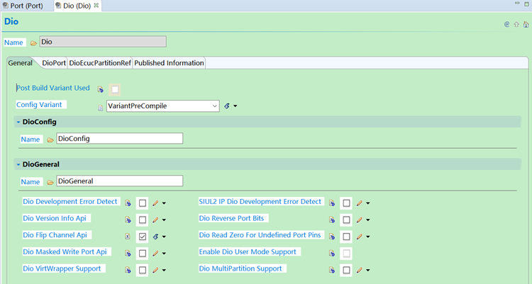配置后Port有些变量会自动刷新如PortNumberOfPortPins=3,然后就是DIO配置环节,类似Port配置,选择DIO需要用到的API,