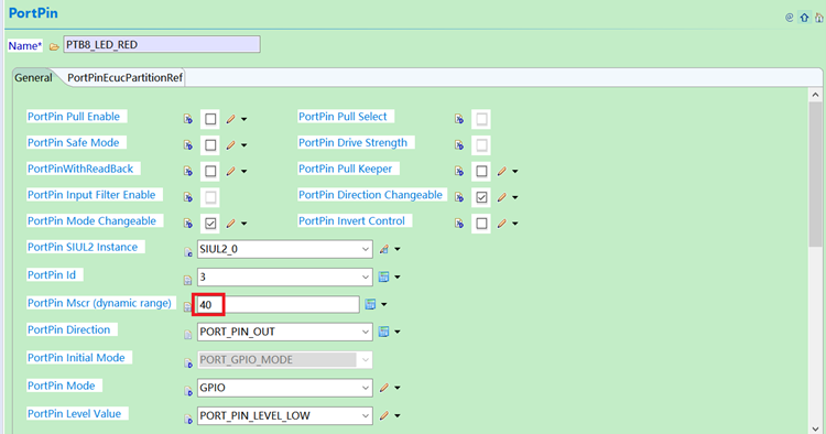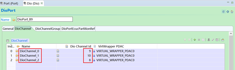 刚才Port配置了引脚编号MSCR,但GPIO端口号没有配置,如MSCR40对应PTB8,MSCR41对应PTB9, MSCR42对应PTB10所以DIO通道新建3个对应实例,