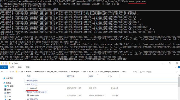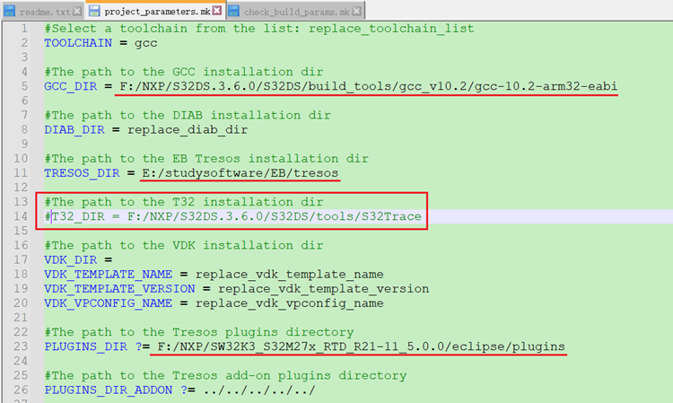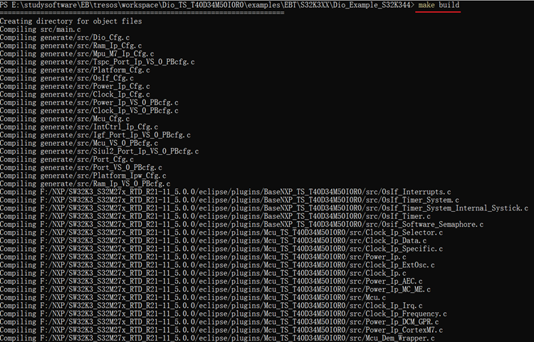 RTD装完后再目录SW32K3_S32M27x_RTD_R21-11_5.0.0\eclipse\plugins下有很多例程,选择Dio_TS_T40D34M50I0R0\examples\EBT\S32K3XX\Dio_Example_S32K344进入,因电脑有make环境,安装官方教程【S32K 进阶之旅】S32K3 RTD MCAL 开发环境搭建(详细教程) - 大大通(简体站) (wpgdadatong.com.cn) ,需要指定工具链路径,具体在project_parameters.mk设置GCC_DIR、TRESOS_DIR、PLUGINS_DIR,