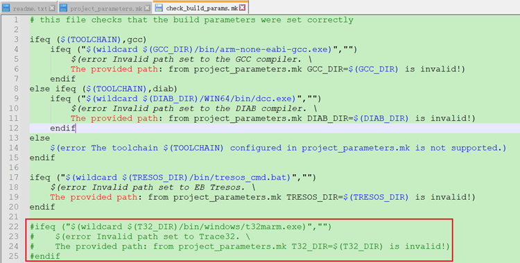 此时 编译还是会提示错误“check_paframeters.mk:23 Invalid path set to trace32”需要同时project_parameters.mk里的T32_DIR和check_build_params.mk里最后那行T32_DIR命令都关掉,此时再进行编译就不会报错,