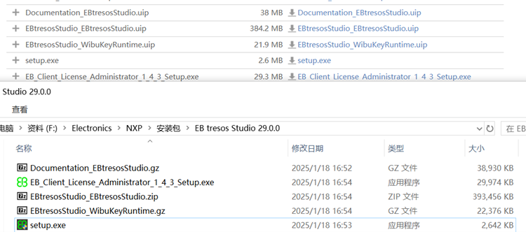 先安装EB,其中EB有3个插件Documentation_EBtresosStudio.uip、EBtresosStudio_EBtresosStudio.uip、EBtresosStudio_WibuKeyRuntime.uip下载完后后缀会自动变成.gz后缀,EB是无法识别的,是需要手动改回.uip后缀,这样安装时就能在界面识别出来这些插件: