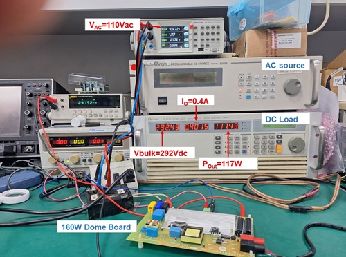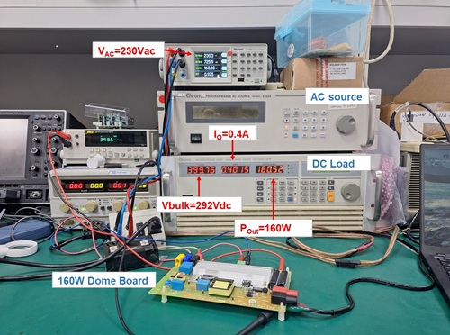 本方案使用安森美半导体(Onsemi Semiconductor) NCP1623A CrM PFC控制器直接取代NCP1622做160W前端稳压解决方案,从图二可以看出本方案在低压110Vac输入、负载为0.4安培时,其输出电压为290Vdc。从图三可以看出本方案在高压230Vac输入、负载为0.4安培时,其输出电压为400Vdc。图四为本方案在各不同输入电压与负载时,其效率的表现,从图四可以看出本方案从10%负载到100%负载在各不同输入电压下都可以维持在89% 以上的效率表现。