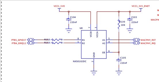 用到了开发板上的PTB5和PTB4,这两个引脚经过了一个电平转换芯片,高电平为3.3V: