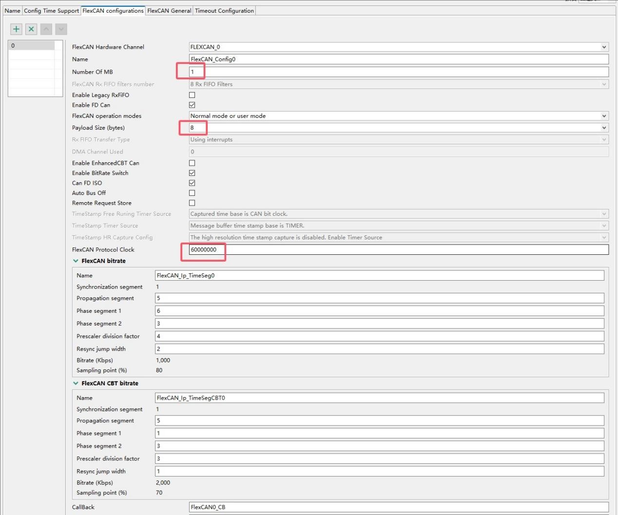 对于FlexCAN的配置则是参考论坛的帖子进行的,自己改了一些参数,设置1MB长度,Payload 8字节,协议时钟和波特率参数则是照抄: