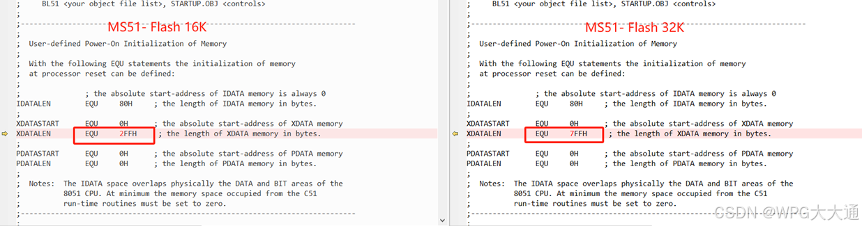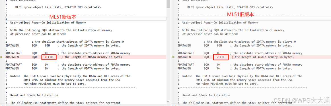 针对ML51系列产品,目前有16K、32K、64K产品,代码是上下兼容的,我这边查了2020年的ML51旧版本STARTUP.A51,当时芯片比较少,XDATALAN是2FFH,目前ML51新版本代码已经改成FFFH。所以建议针对ML51全系列产品的XDATALAN直接改成0FFFH。