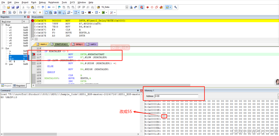 1、 进入仿真,在需要测试RAM的地方打个断点,比如在XDATALAN下面执行的地方打个断点,在main()程序的第一行代码也打个断点。这样做的目的可以确定,执行完成STARTUP.A51文件后,跳转到main时,RAM变量是否清零。