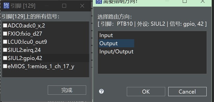 在引脚配置界面中,勾选 PTB10,接着在弹出的对话框中,选择 SIUL2:gpio42;然后在弹出的“需要指明方向”,选择 Output;