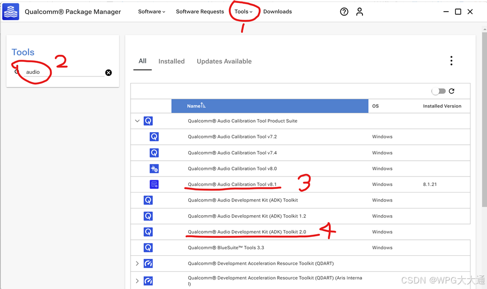 然后按照下图所示,先点击窗口顶端tool,再在左侧搜索栏搜索audio,就会筛选出所有何audio相关的软件包.按照当下需要,我们将要下载两个软件分别是qact8.1,adk2.0