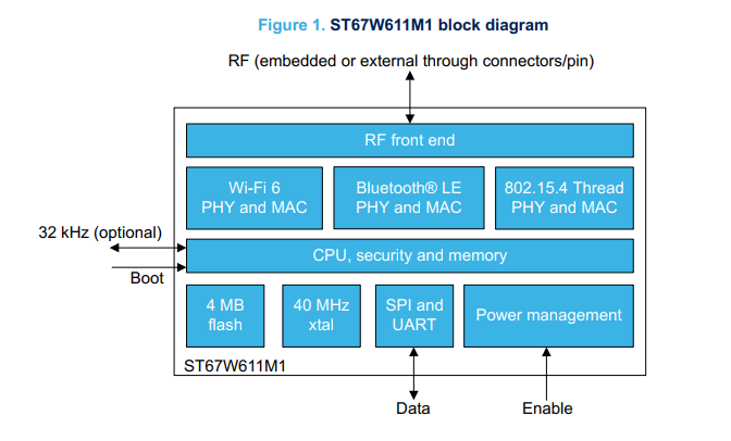 凭借与STM32Cube生态系统的深度整合及相关认证,ST67W611M1成为物联网系统集成Wi-Fi®/Matter/蓝牙®组合模块的理想选择。新模组因其高集成度大幅简化PCB设计,例如,仅需借助SPI接口(无需UART)即可实现Wi-Fi与蓝牙功能。