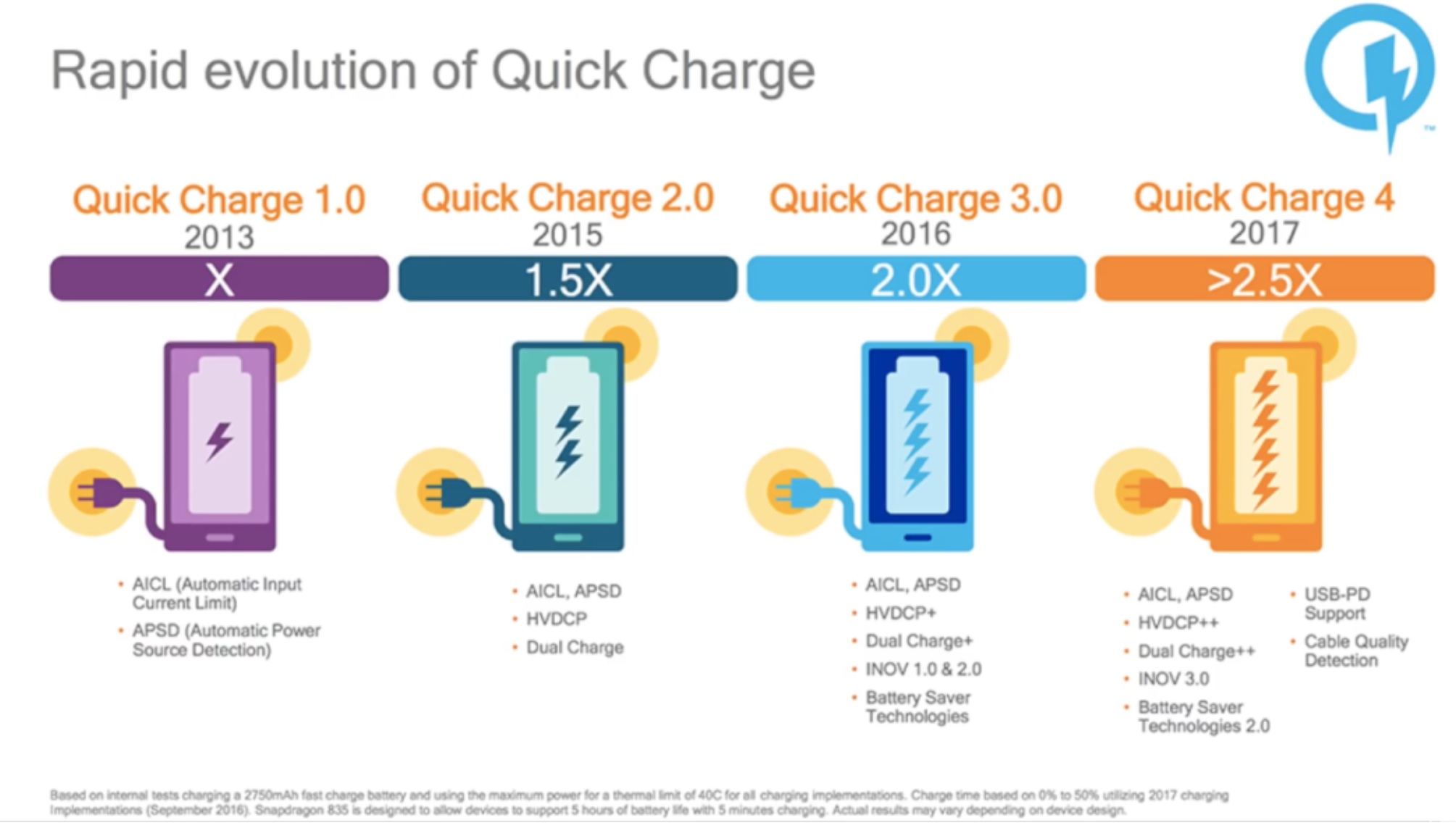 - 高通的QC快充(9V/2A,4~12/3A);QC快充协议,全称Quick Charge,是高通公司发布的快充技术,到今天,已经经历了5代,来到了QC 4.0+。由于是手机芯片的龙头大哥,所以高通很早就在自家芯片商集成了快充协议,但是很多非高通处理器的手机也是可以支持QC快充协议,因为PD快充协议兼容QC协议。QC 2.0,开启了高电压充电时代,提供了5V、9V、12V、20V四组电压档位;QC 3.0时代,细化到以0.2V为一档调整;QC 4.0支持3.6-20V波动电压(接口要求必须为USB C);QC 4.0+在4.0的基础上兼容QC3.0和QC2.0。除了QC 4.0只兼容PD协议以外,QC 2.0、QC 3.0、QC 4.0+都是向下兼容低版本。