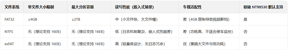 行车记录仪常用的文件系统有FAT32、NTFS、exFAT三种,其特性差异直接影响使用体验,具体对比如下: