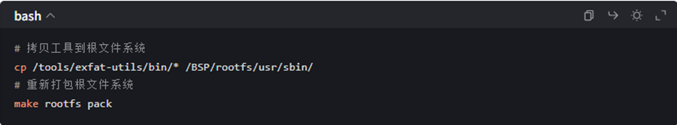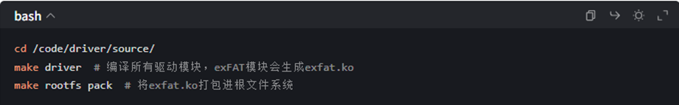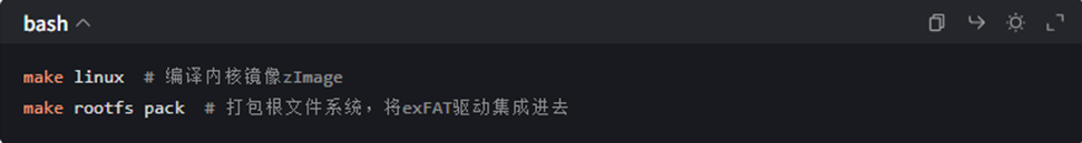 内核内置方案将exFAT驱动编译进Linux内核镜像(zImage),开机后无需手动加载,稳定性更高,适合量产场景。