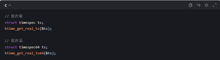 将timespec类型替换为timespec64:Linux 4.19后,内核统一使用64位时间类型timespec64,timespec已被废弃,不修改会报“error: unknown type name ‘timespec’”;