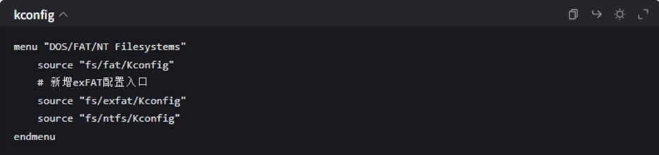 Kconfig用于配置内核编译选项,需将exFAT驱动的配置项添加到“DOS/FAT/NT Filesystems”菜单下,确保编译内核时可选择启用exFAT。