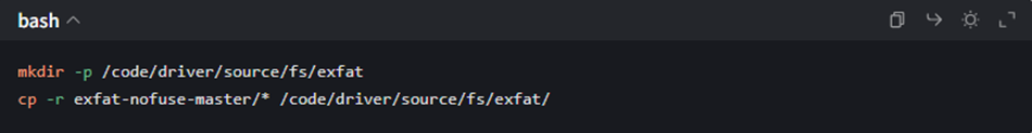 联咏NT98530的驱动开发目录通常为/code/driver/source/,新建fs/exfat目录,将预处理后的`exfat-nofuse-master`文件拷贝进去: